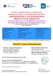 In occasione della Giornata Mondiale della sindrome di Down, l’ AIPD FROSINONE e l’ ASL di Frosinone presentano il progetto “Parliamo della sindrome di Down”, presso l’Aula Magna della scuola A. Carbone, invitando i tre comprensivi di Sora per aiutare ogni scuola ad essere un luogo dove tutti stanno bene e possono imparare